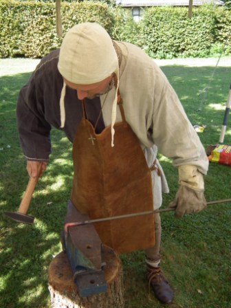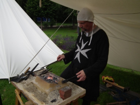 Seit zwei Jahren übe ich mich jetzt auch im Schmieden. Eine Esse mit Blasebalg habe ich mir selbst gebaut. So ein paar Grundkenntnisse hatte ich schon, Mit einem Auffrischkurs bei Nils Holloh in Salzgitter flutscht es schon besser. Die Anfertigung von kleineren Teilen, wie Messer, Essdorne und Haken. Und alles was man im Lager oder für die Ausrüstung gebrauchen kann.